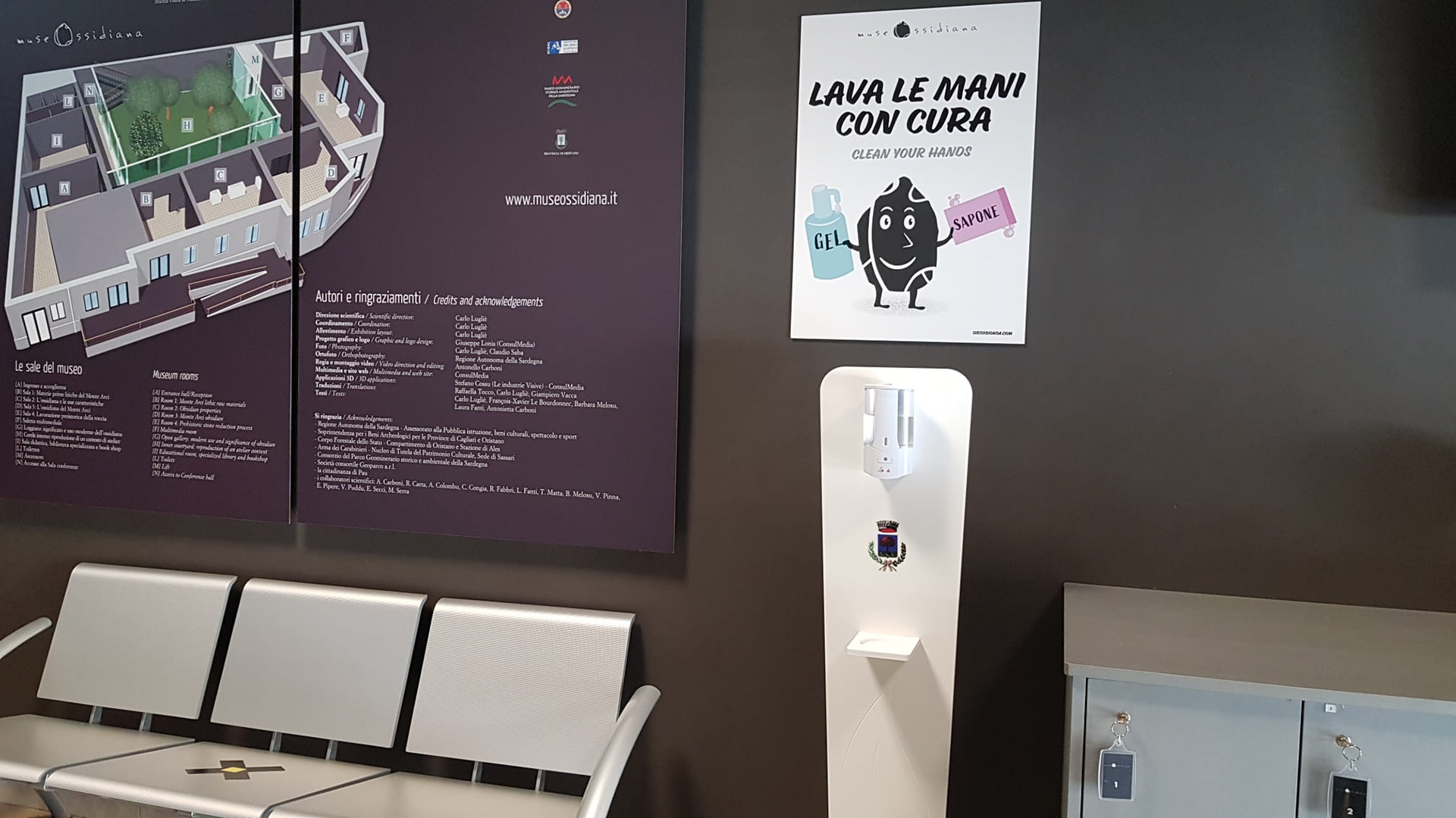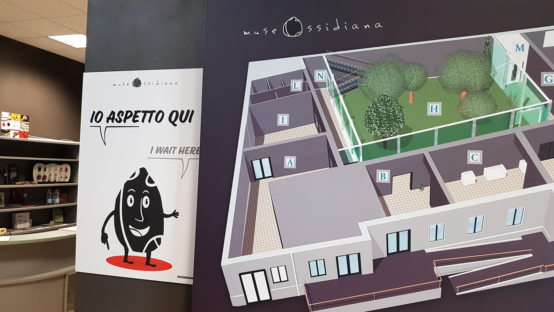 La scheggia di ossidiana, già presente nel logo del museo si anima per la segnaletica di sicurezza Covid.